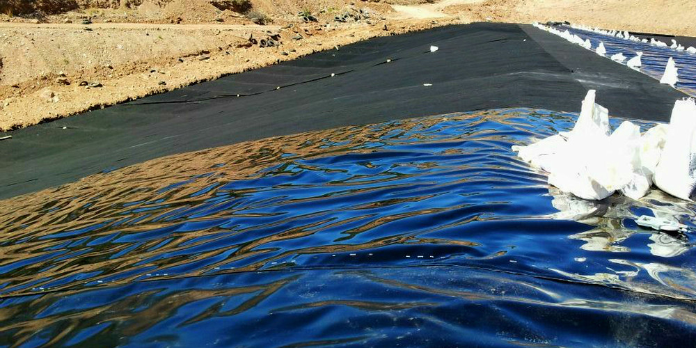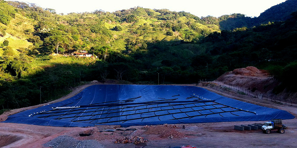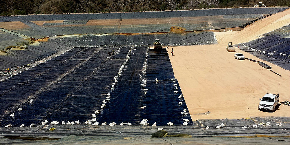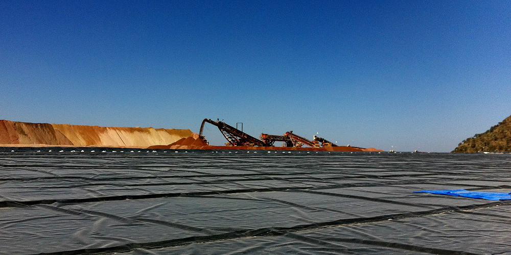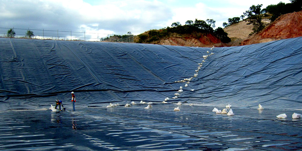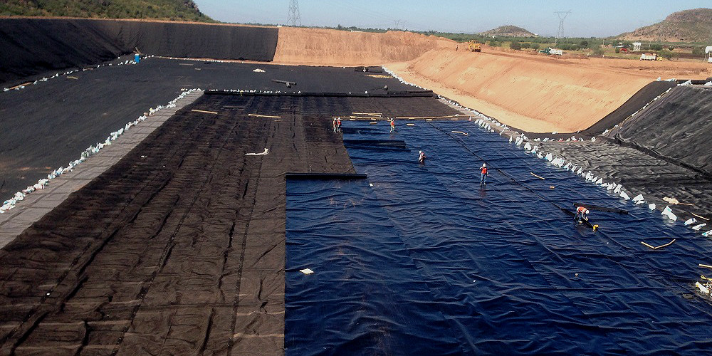 Mineria. Pileta de Tormentas, instalación de geomembrana.