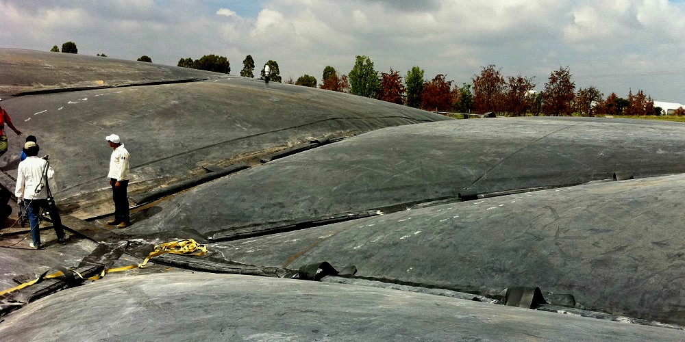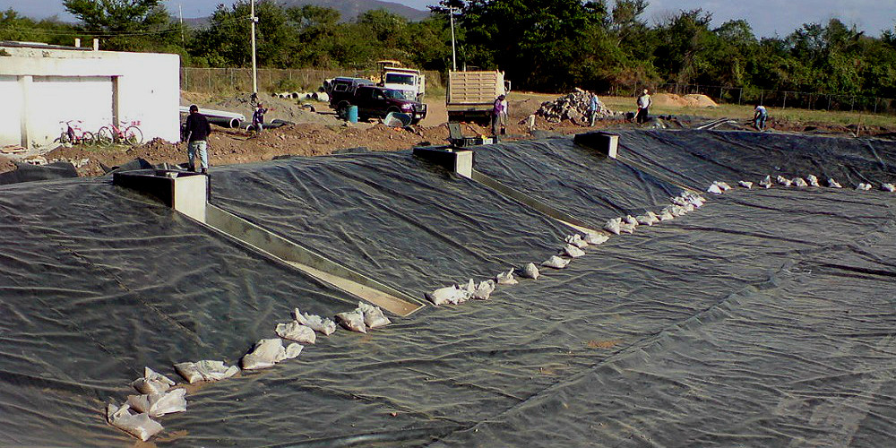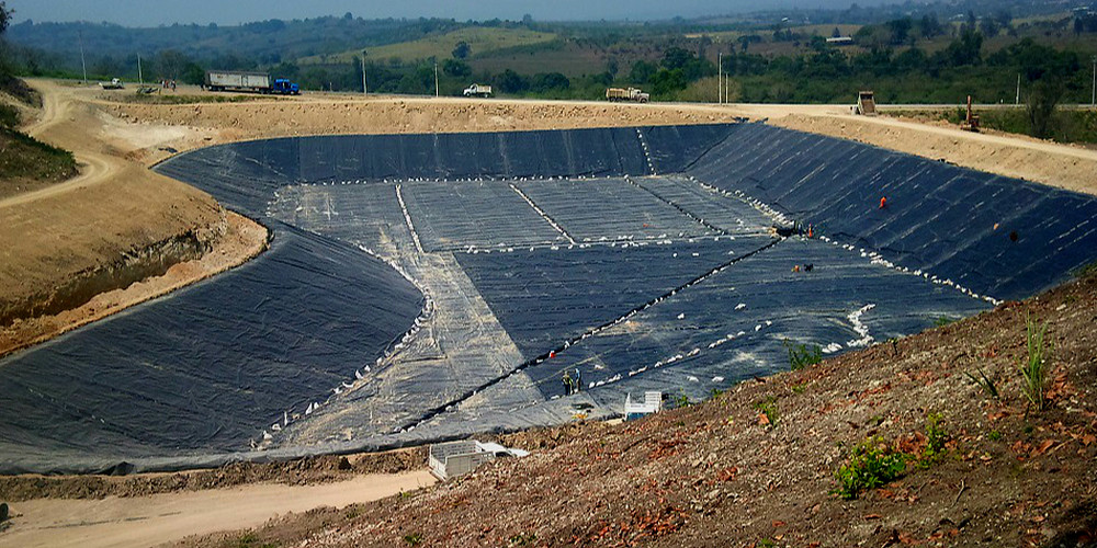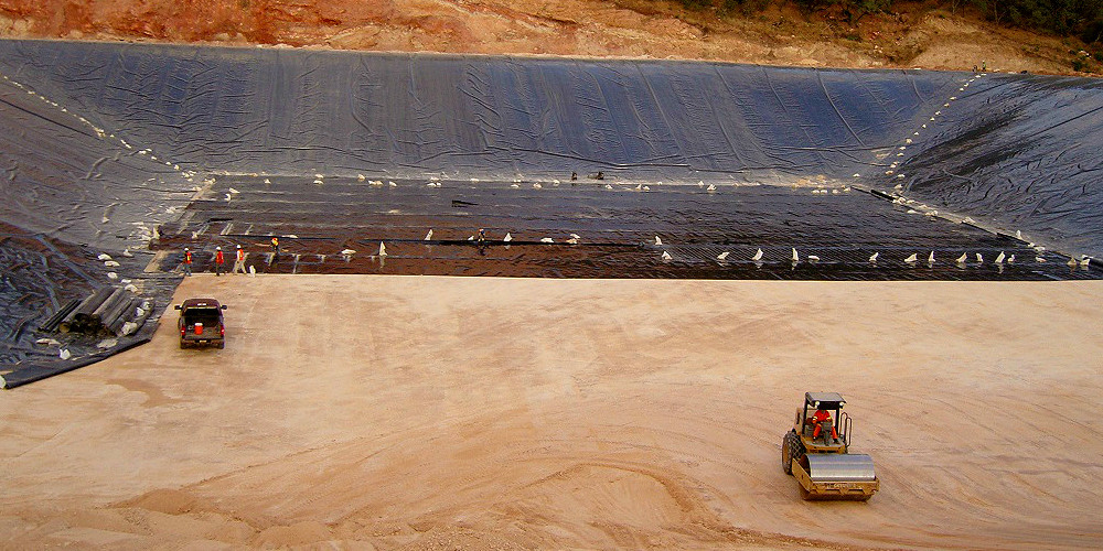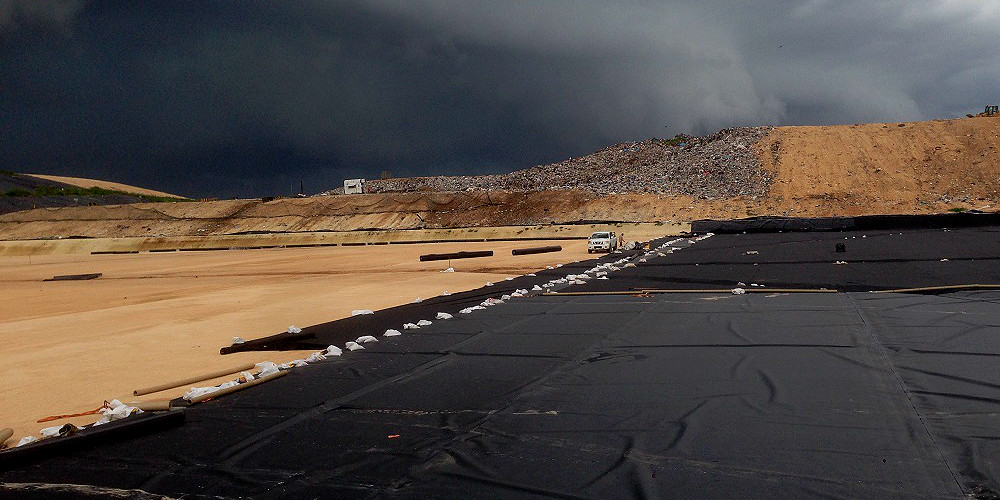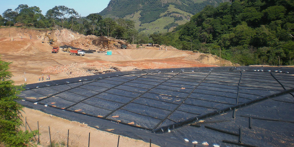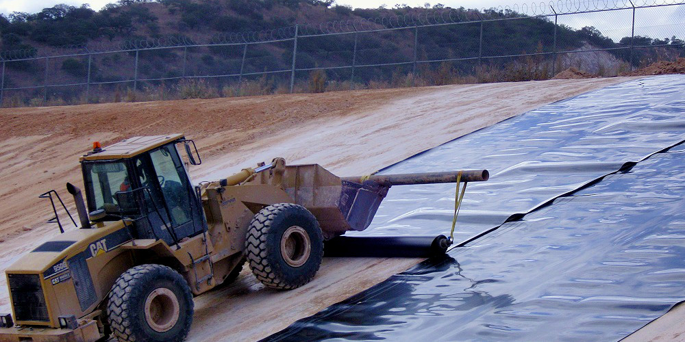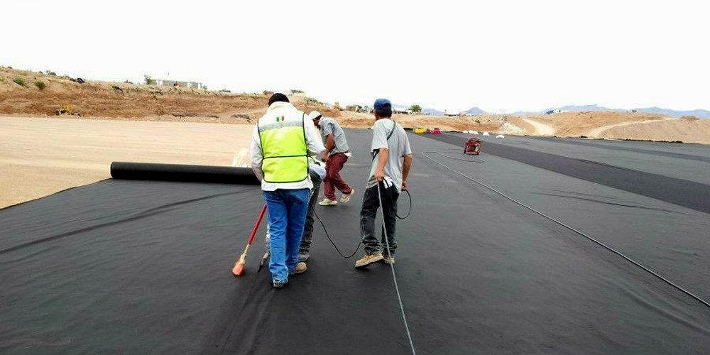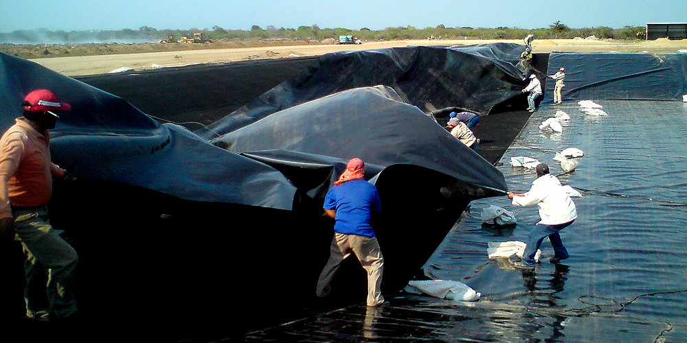Desechos. Instalación de geotextil y geomembrana en relleno sanitario.