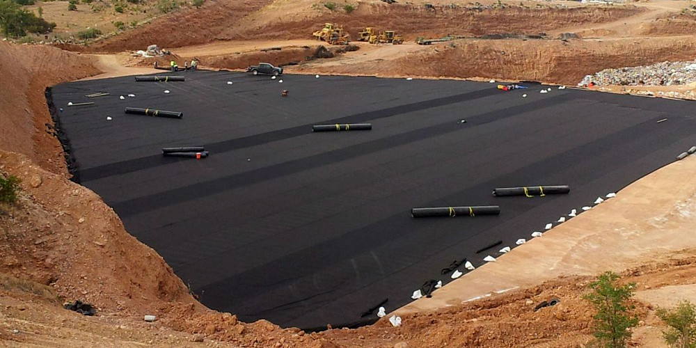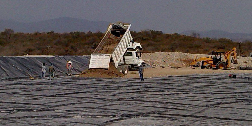 Desechos. Instalación de geotextil en celda de relleno sanitario.