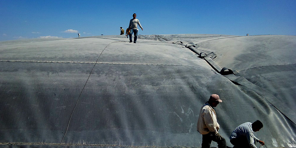 Minería. Instalación de geomembrana en pileta de tormentas.