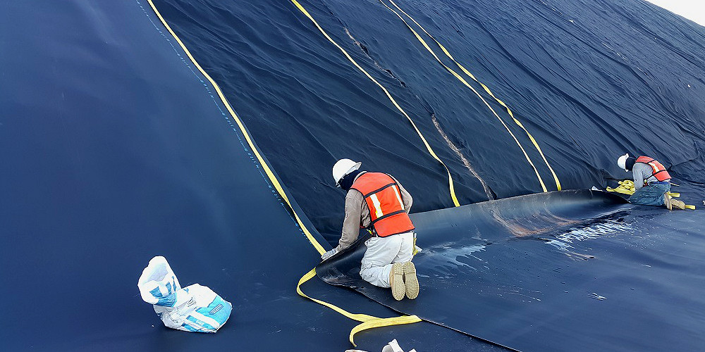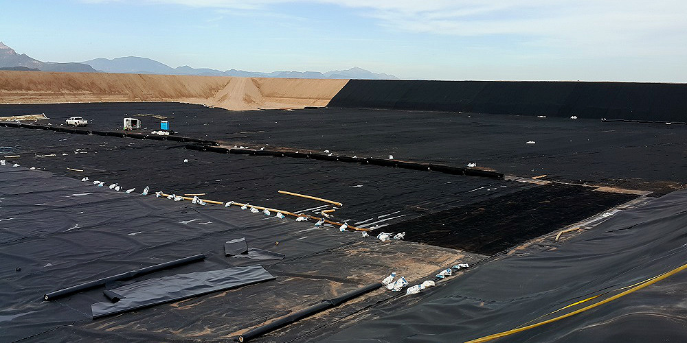 Minería. Instalación de geomembrana en pileta de solución rica.
